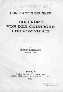 Constantin Brunner, eigentlich Leo Wertheimer, wurde am 27. August 1862 in Altona geboren. Der einer jüdisch gläubigen Familie abstammende Leo studierte von 1884 bis1888 Geschichte und Philosophie in Berlin und Freiburg. Anschließend ging Constantin Brunner, so nannte er sich seit 1891, nach Hamburg, um dort als Literaturkritiker zu arbeiten.1893 gab er mit Leo Berg die literarische Zeitschrift „Der Zuschauer“ heraus. Dort wurde auch, der für sein philosophisches Denken wichtige Aufsatz „Zur Technik des künstlerischen Schaffens“ veröffentlicht. Der Kulturbetrieb Hamburgs gab ihm aber nicht den Spielraum den er für die Ausarbeitung seiner Philosophie benötigte. Ende 1895 geht er nach Berlin, später nach Potsdam. Die folgenden Jahre arbeitete Brunner an seinem Werk, das 1908 mit dem Titel „Die Lehre von den Geistigen und vom Volk“, unterstützt von seinem damaligen Freund Gustav Landauer, veröffentlicht wurde. Nach der theoretischen Grundlegung, und der Behandlung der geistigen Fakultät im Buch „Unser Christus oder das Wesen des Genies“, berücksichtigte Brunner zunehmend die praktische Seite seiner Philosophie. Bereits in seiner Studentenzeit begegnete ihn der Judenhaß. Den Judenhaß lehrt Brunner als einen Spezialfall der weitverbreiteten verkehrten Denkweise. Das fiktive Denken wird exemplarisch mit der Gesellschafts- und Staatslehre, die er im Buch „Der Judenhaß und die Juden“ erstmals darlegt, erläutert. Der Judenhaß, den Brunner als Menschenhaß lehrt, beschäftigte den Philosophen bis in die frühen dreißiger Jahre. Einige Bücher erschienen zu dieser Problematik, wie auch zu medizinischen und weiteren philosophischen Fragen. In dem 1928 erschienenen Buch „Materialismus und Idealismus“ erreicht sein philosophisches Denken den reifsten Ausdruck.1933 mußte der antizionistische Philosoph, der sich für eine lebendige Kultur Deutschlands einsetzte, und bereits früh gegen den deutschen Nationalsozialismus schrieb, mit seiner Familie emigrieren. In Den Haag verlebte er noch einige Jahre. Dort verstarb Constantin Brunner am 27. August 1937.